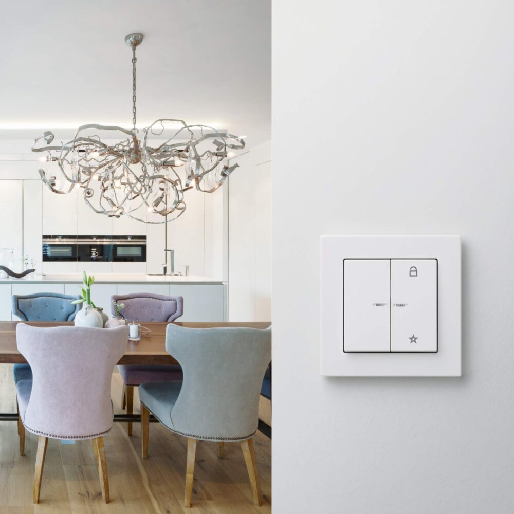 Smart functions, stylish design: the KNX F 10 push-button has the appearance of a classic light switch, but controls intelligent KNX technology.