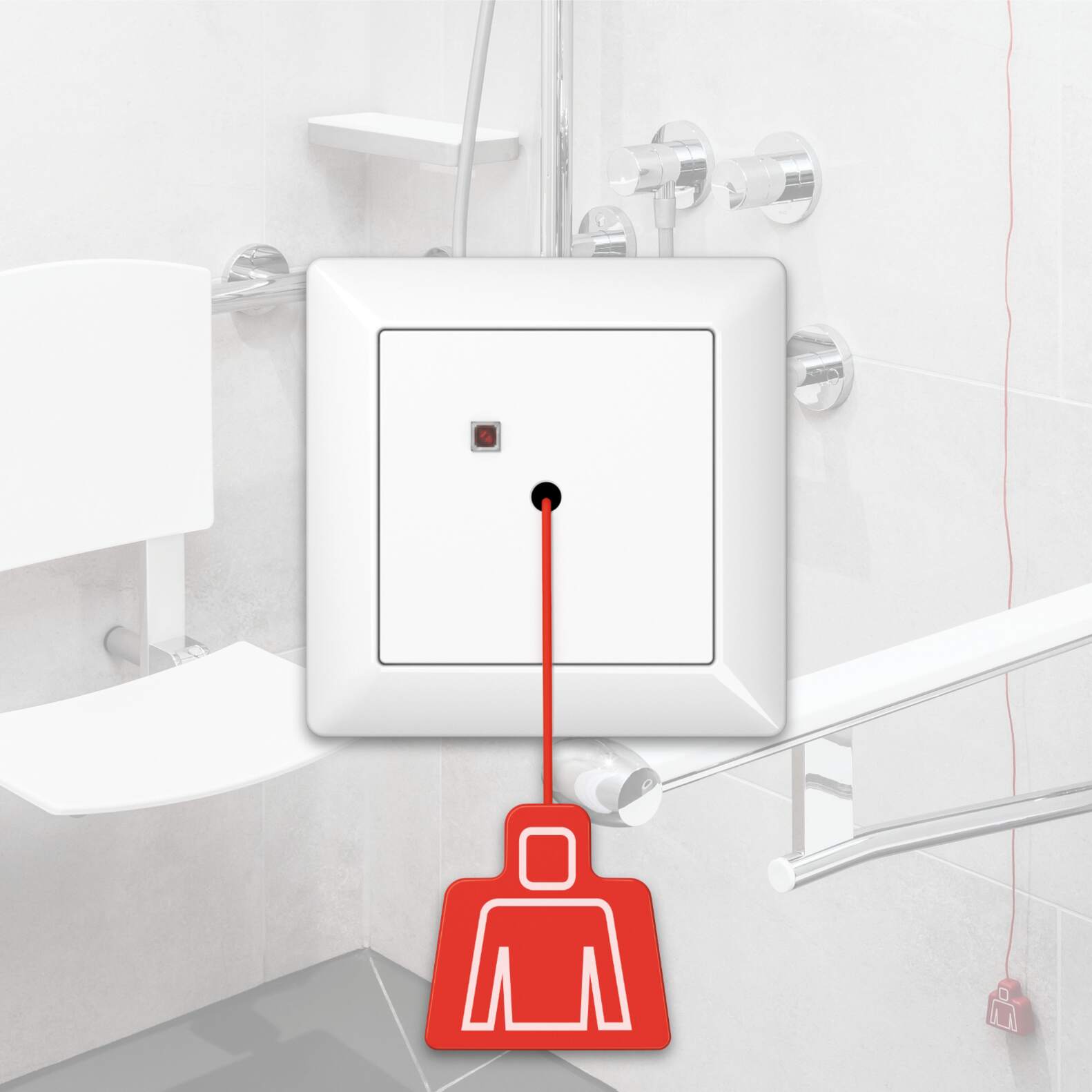 The DIN 18040-1 standard for publicly accessible buildings provides that barrier-free toilets must have an emergency call system. The JUNG emergency system set fulfils this requirement and additionally corresponds to the central standard for implementing emergency call systems of the Verband Deutscher Elektrotechniker (Association of German Electricians) for care facilities, hospitals and other public institutions (DIN VDE 0834). It is thus particularly suitable for use in nursing homes or WC installations in public buildings.