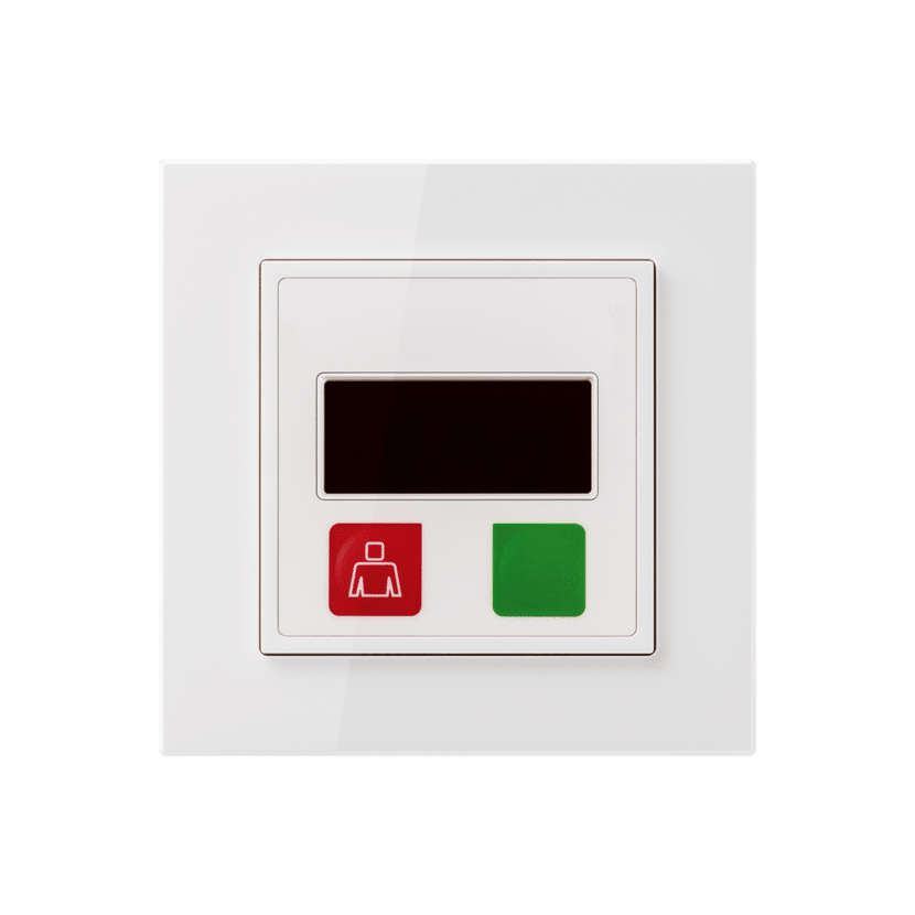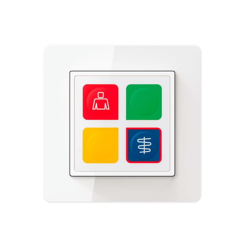 Call buttons for the patient and resident rooms are available in different versions, such as here with a button combination consisting of call button, doctor call button, presence button and reset button.