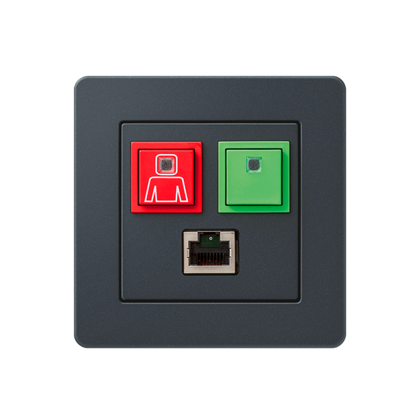 The variable room modules are also available with an RJ-45 socket. For example, the nurse can connect multiple push-buttons or other mobile operating devices to it.