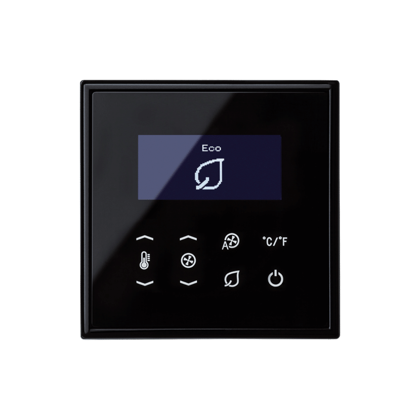 The JUNG fan coil room thermostat provides the temperature needed in the hotel room. In the switch design and with a high-quality, real glass front, the control fits harmoniously into the interior. Clear information and unambiguous symbols make it easy for the guests to select the appropriate climate mode for their own comfort. The "Eco" mode, one of four operating modes, meets the demands for more energy efficiency. A special feature: the display is darkened in the idle state so that the sleep of the guest is not disturbed. JUNG fan coil controller is available for fan coil units with 2 or 4-pipe systems.