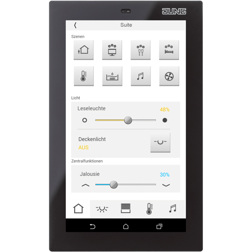 Positioned at a central point in the room, JUNG touch displays can be used to call set scenes. They are intuitive to operate thanks to the logically designed user interface.