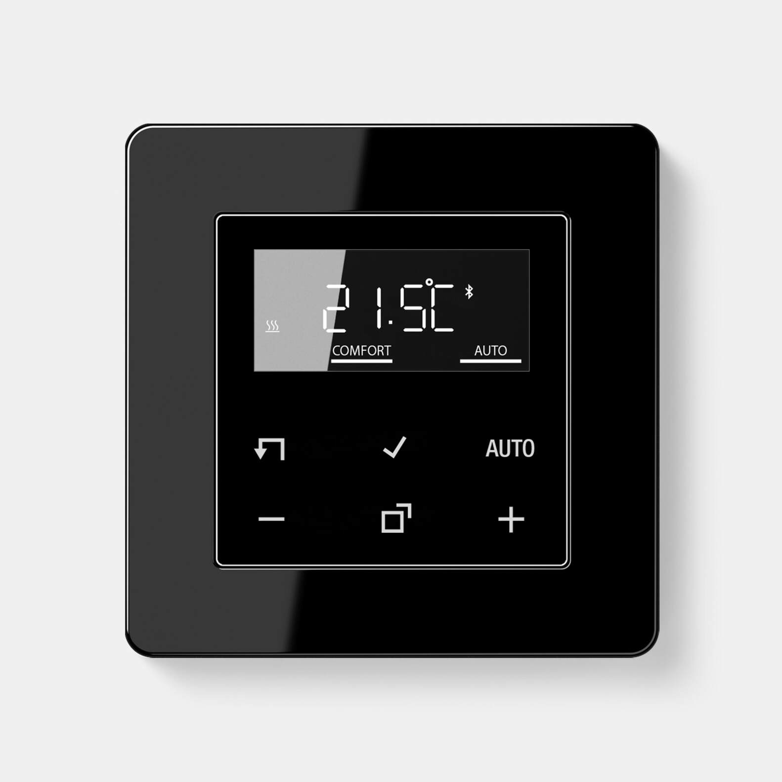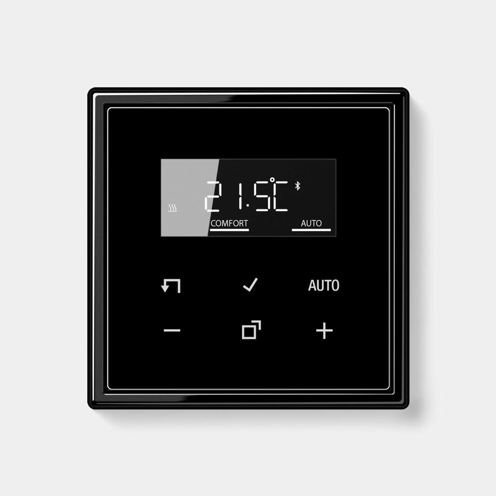 The room thermostat with display in real glass enables the control of the heating in your smart home. It detects a fall in temperature, for example when a window is opened, and switches the heating to frost protection mode. The temperature control can be integrated into scenes.