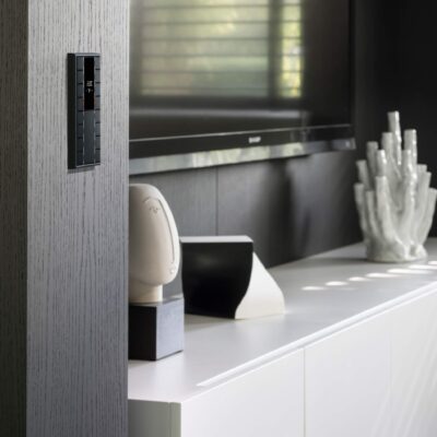 The thin frames of the LS 990 range in matt graphite black are compatible with all centre plates from the JUNG LS range. These include light switches, sockets for international systems, multimedia connections, universal LED dimmers and KNX push-buttons.