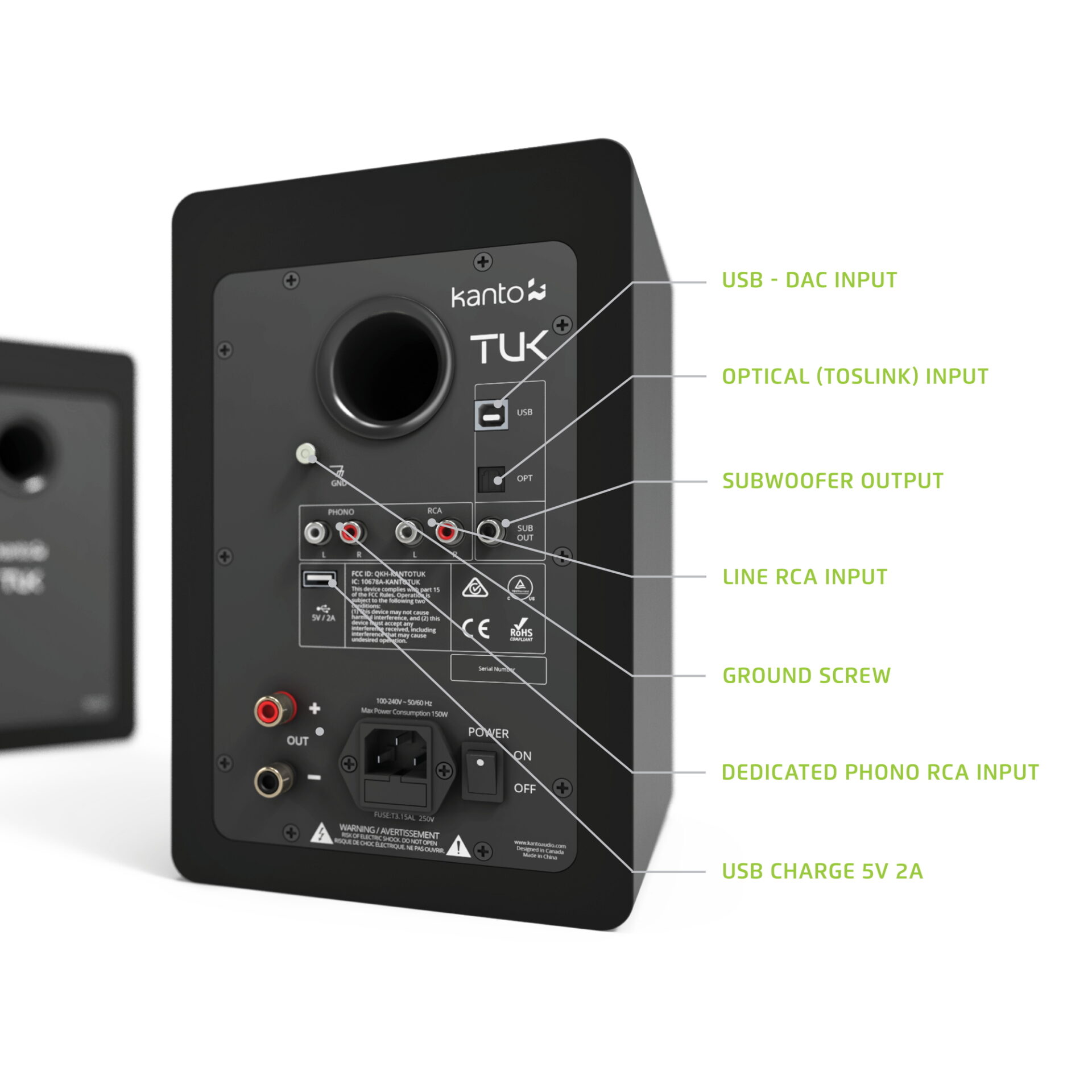 Its active crossover further improves low-end resolution by filtering out sub-80Hz frequencies when connected to a subwoofer. Outfitted with dedicated phono, RCA and Optical TOSLINK inputs, a built-in USB DAC and headphone amp, and Bluetooth 4.2 with aptX HD and AAC codecs, TUK provides the flexibility you need to enjoy all your devices.