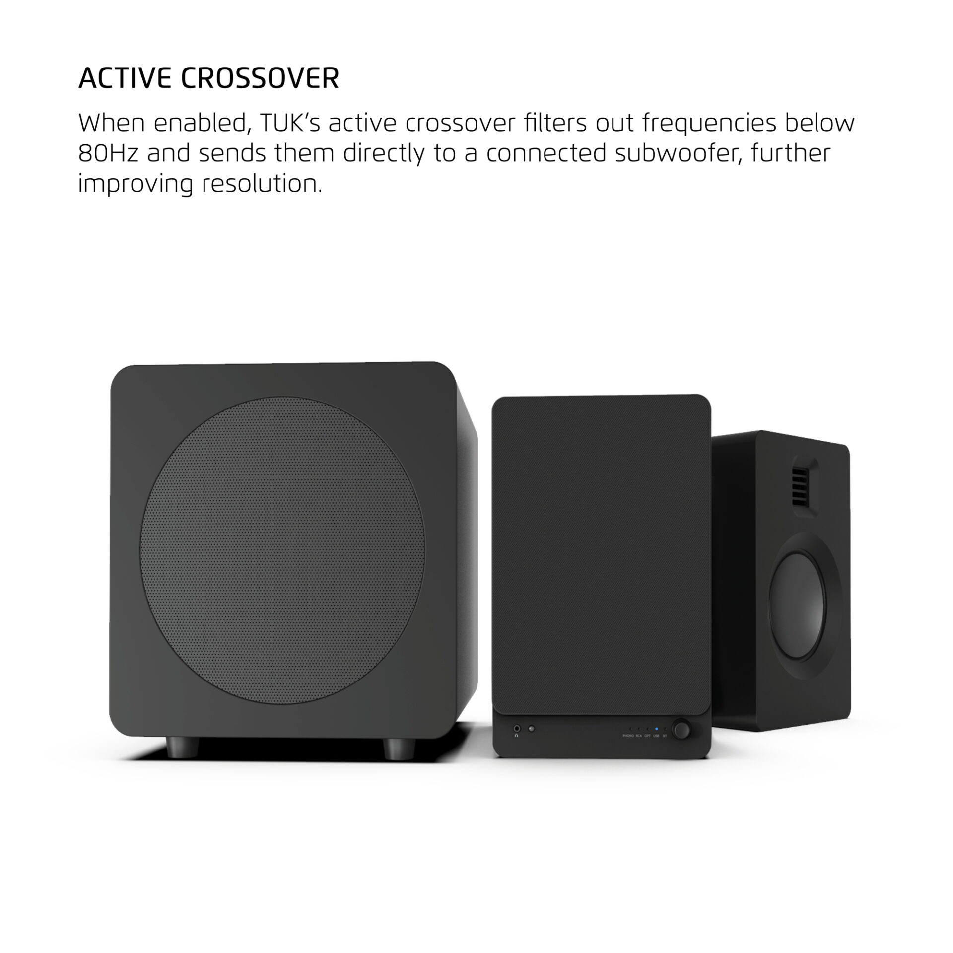 - ACTIVE CROSSOVER – When enabled, TUK’s active crossover filters out frequencies below 80Hz and sends them directly to a connected subwoofer. Off-loading this portion of the frequency range further improves resolution while reducing distortion.