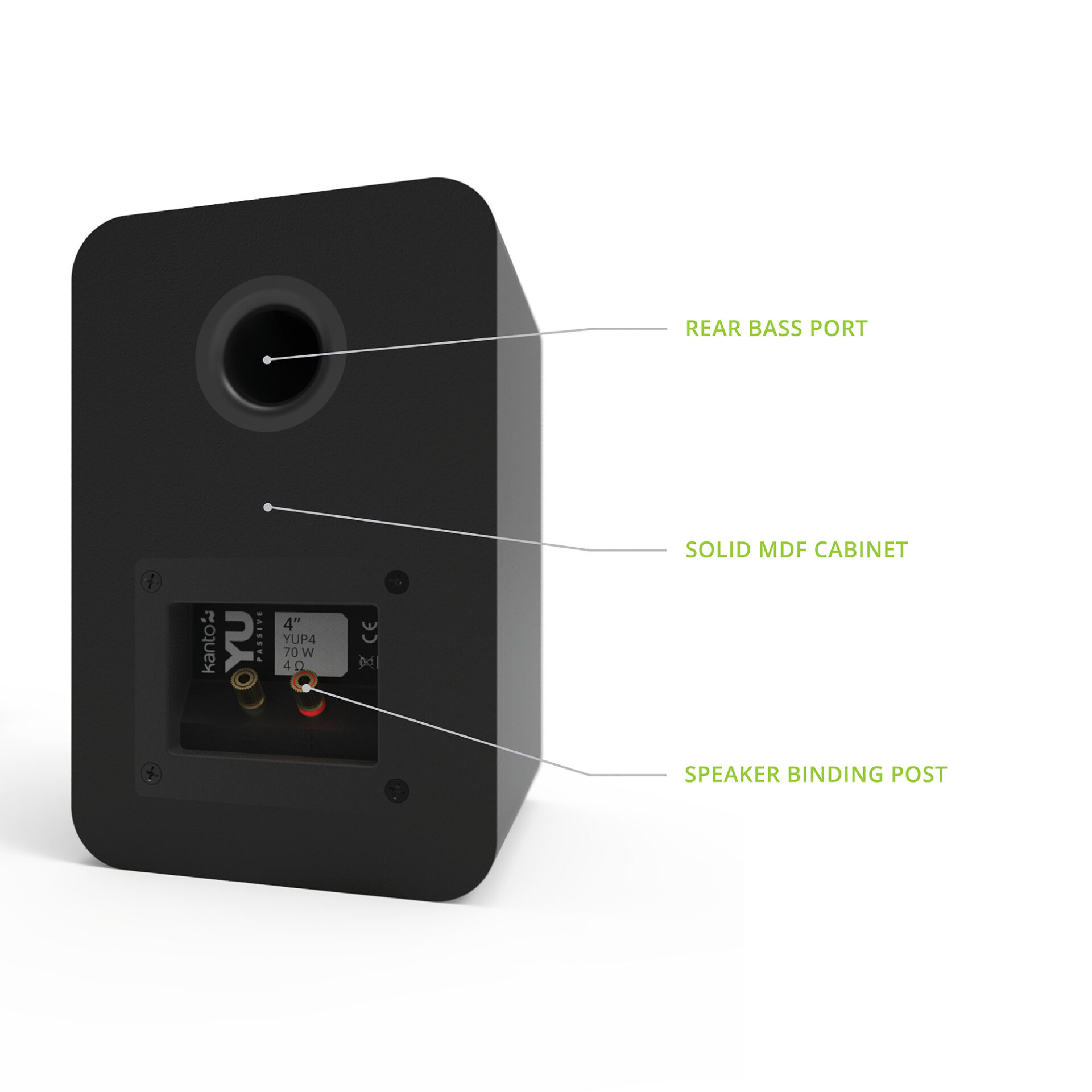 Featuring 4-inch Kevlar® woofers and 1-inch silk dome tweeters, these speakers produce a neutral, balanced tone. A bottom-mounted 1/4”-20 threaded hole attaches to compatible Kanto speaker stands for confidence-inspiring security and audio coupling. YU Passive works great on a desktop with a DAC/amp combo, or in a dedicated two-channel listening station. Enhance your TV’s sound by connecting YU Passive to an integrated amp or add them into a home theatre system as rear, side, or height channels. Available in both black and white, these passive speakers compliment any aesthetic.