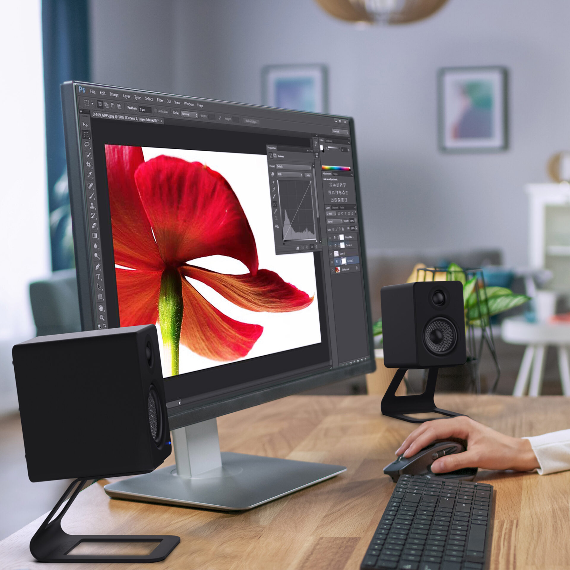 3” composite drivers ensure a distortion-free bass and midrange, while the 3/4” silk dome tweeters effortlessly produce scintillating highs. A specially tuned bass-port on the rear extends the low end while keeping airflow away from your active workspace. If deep bass is your thing, simply connect a subwoofer to the SUB OUT port and revel in pure low-end bliss.