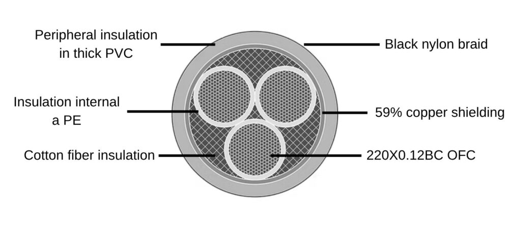 Copper shielding for optimised insulation against surrounding electromagnetic and radio frequency radiation (RFI & EMI): optimal cotton fibre to reduce micro-vibrations internally, thick PVC insulation externally.