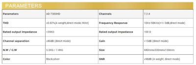 The AD-7300HD processes advanced audio formats including Dolby Atmos and DTS , providing an immersive 7.2.4 channel surround sound experience ideal for home theater enthusiasts, equipped with 4K/60Hz video handling and support for HDR10 and Dolby Vision.