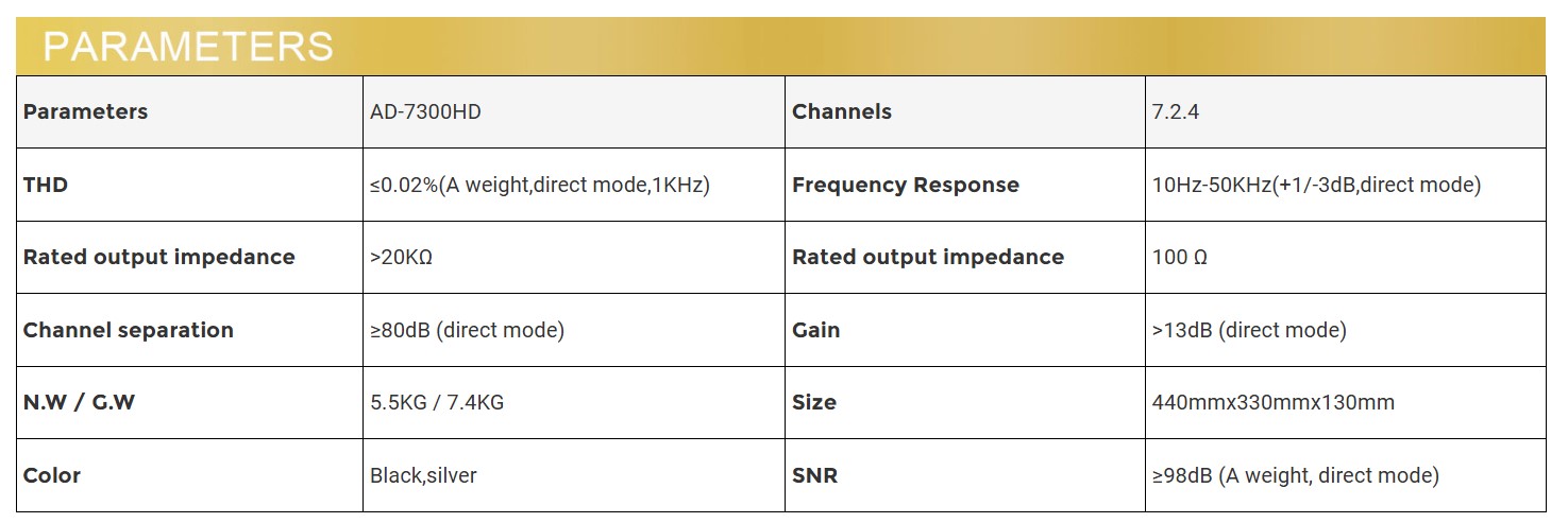 The AD-7300HD processes advanced audio formats including Dolby Atmos and DTS , providing an immersive 7.2.4 channel surround sound experience ideal for home theater enthusiasts, equipped with 4K/60Hz video handling and support for HDR10 and Dolby Vision.