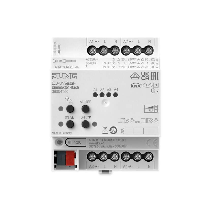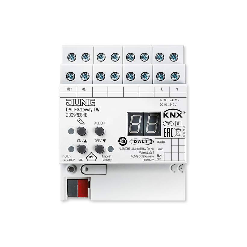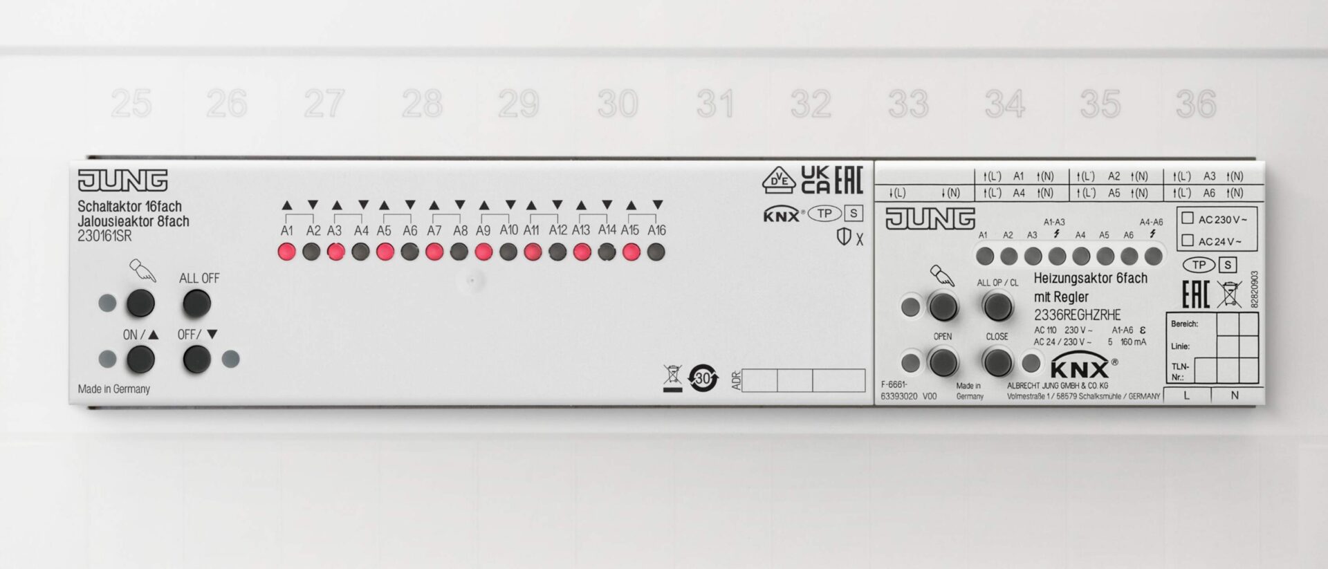 The various KNX actuators for rail mounting are impressive due to high functionality in compact design, allowing the space in the distribution to be used optimally - with a significantly higher load range: like the JUNG KNX DALI gateway TW. It forms the interface to the control of DALI Tunable-White luminaires in a KNX installation. In this way, controlling up to 64 DALI devices in 32 groups is no problem. Switch or dim a large number of luminaires, and that without any heat loss? No problem with rail-mounted actuators! In addition, the JUNG KNX rail-mounted actuators fulfil the standards of the VDE test and certification institute.